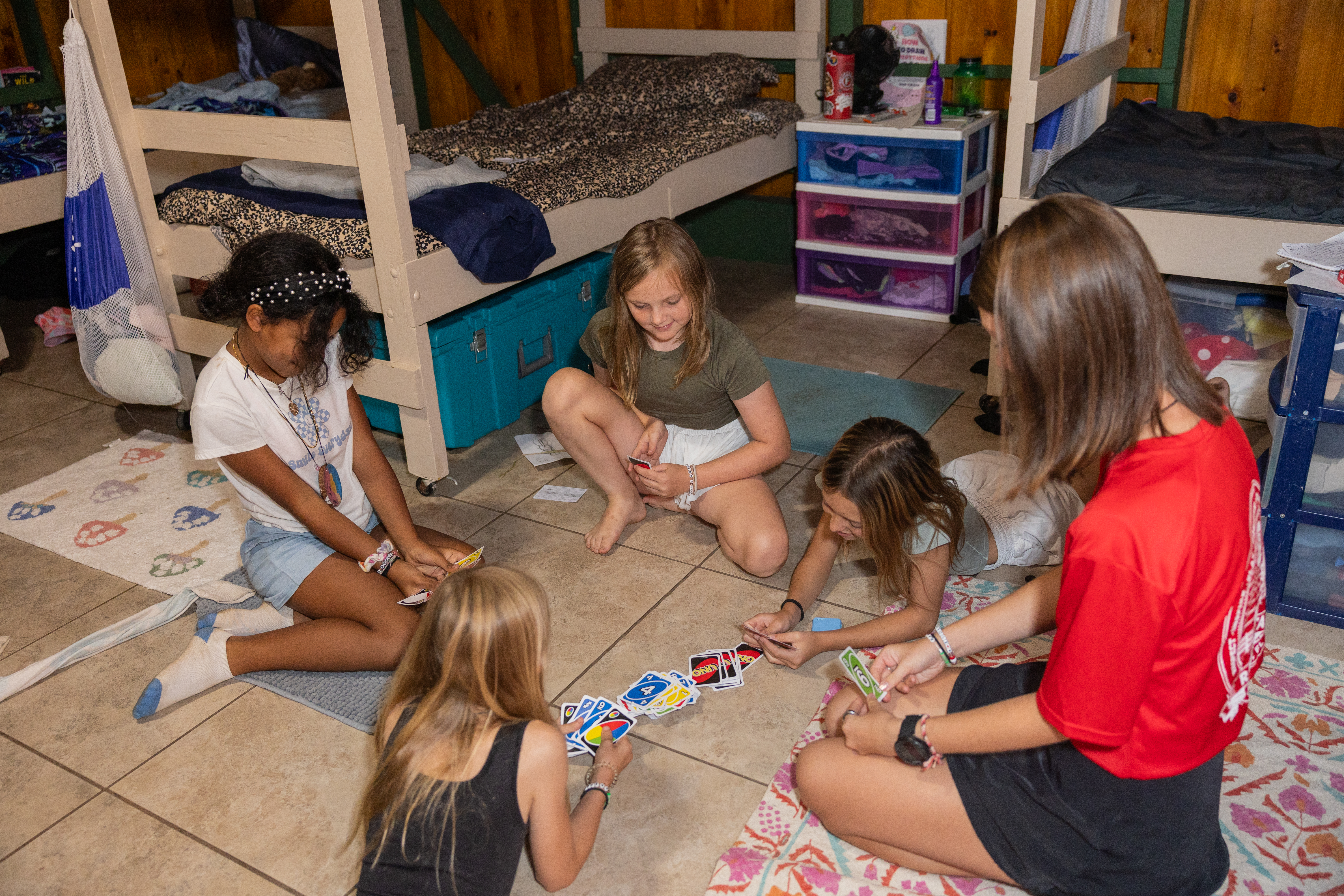 Campers bunk with friends in their age bracket. Each cabin features six bunk beds, housing 12 people, and has its own bathroom, air conditioning, and heat. Thanks to our low 3:1 camper to staff ratio, kids get extra guidance and care while mixing it up in activities, games, and all around fun.